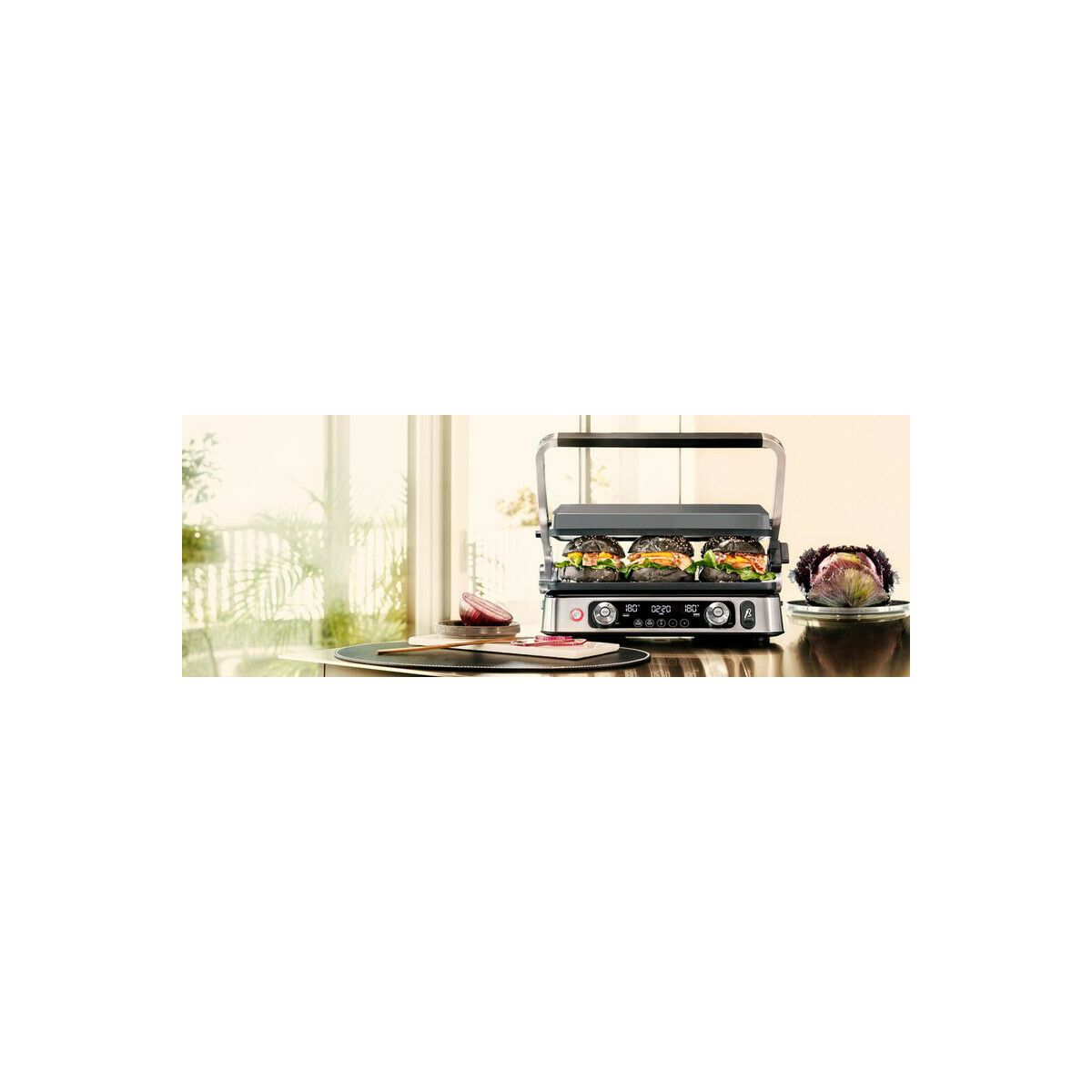Zaradi pametne kombinacije treh kompletov različnih plošč in treh prilagodljivih položajev za kuhanje lahko uživate v neomejeni vsestranskosti. Izkusite popolne rezultate pečenja na žaru za zajtrk, kosilo, večerjo in prigrizke.