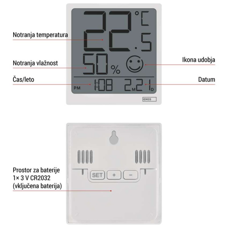 12/24 urni format: da|barvni zaslon (black mask) osvetljen: ne|budilka: ne|časovni pasovi: ne|datum: da|dimenzije glavne enote: 83 × 17 × 88 mm|dimenzije senzorja: ne|doseg na prostem: ne|funkcija štoparica: ne|izvedba termometra: brezžični|koledar: ne|LED osvetlitev zaslona: ne|magnet za pritrditev: ne|min. in maks. temperatura: ne|možen drugi senzor: ne|možnost nastavitve enote temperature °C/°F: da|možnost obešenja na steno: da|napajanje postaje: 1× 3 V CR2032 (priloženo)|napajanje senzorja: ne|notranja temperatura: -10 °C do +50 °C, ločljivost 0,1 °C|notranja vlažnost: 1 % do 99 % RH, ločljivost 1 %|odštevanja časa maks. od: ne|omrežni adapter: ne|ponovno bujenje: ne|prenosna frekvenca: ne|prodajna embalaža: 1 kos, škatlica|spomin zadnje vrednosti: ne|temperaturni indeks: ne|temperaturno opozorilo: ne|trajna osvetlitev: ne|trend temperature: ne|trend tlaka: ne|ura: da, quartz|velikost zaslona: 73 × 73 mm|žična sonda za senzor: ne|zunanja temperatura: ne|zunanja vlažnost: ne
