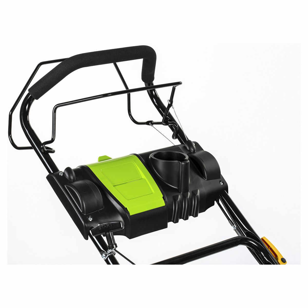 Velika zbiralna košara s prostornino 65 litrov je opremljena z indikatorjem polnosti in vas opozori, ko jo je treba izprazniti. Vendar to ni edini način odstranjevanja pokošene trave. Zahvaljujoč nastavitvi 4 v 1 lahko izberete, ali želite uporabiti zbiralno košaro, uporabiti stranski ali zadnji izmet ali izbrati možnost mulčenja. Zaradi jeklene šasije je skupna teža 29 kg, a funkcija pogona in kakovostna kolesa poskrbijo, da tega niti ne opazite. Zložljiv ročaj za lažje shranjevanje je zelo pogosto standard za prijetno udobje uporabnika.