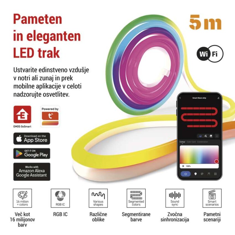 aplikacijski jeziki: EN, CZ, SK, PL, DE, HU, SI, FR, + 60 drugih jezikov|barva ohišja: bela|barva svetlobe: RGBIC|barvne nastavitve (RGB): da|dolžina: 5 000 mm|dolžina dovoda: 1,6 m|energijski razred vključenega svetlobnega vira: –|garancijska doba: 2 leti|kategorija: –|kompatibilnost: EMOS GoSmart, Tuya, Lidl, Smartlife|linija: GoSmart|material difuzorja: silikon|material ohišja: silikon|največje število segmentov: –|nastavitev barvne temperature: ne|oblika: –|obvestila v mobilno aplikacijo: da|podprt OS: iOS, Android|potemnitev: da|prenosna frekvenca: 2,4 GHz (IEEE 802.11b/g/n)|prihodna moč: 33 W|prodajna embalaža: 1 kos, škatlica|protokol: WIFI + BLE|RGB digital: da|širina: 18 mm|število segmentov: –|število vklopnih ciklov: –|svetlobna učinkovitost: –|svetlobni tok: –|tehnologija: LED|temperatura kromatičnosti: –|upravljanje z glasovnimi pomočniki: da (Amazon, Alexa, Google Assistant)|vhodna napetost: 200–240 V~/50 Hz|višina: –|vključen vir svetlobe: –|zaščita: IP20|življenjska doba: 20 000 ur