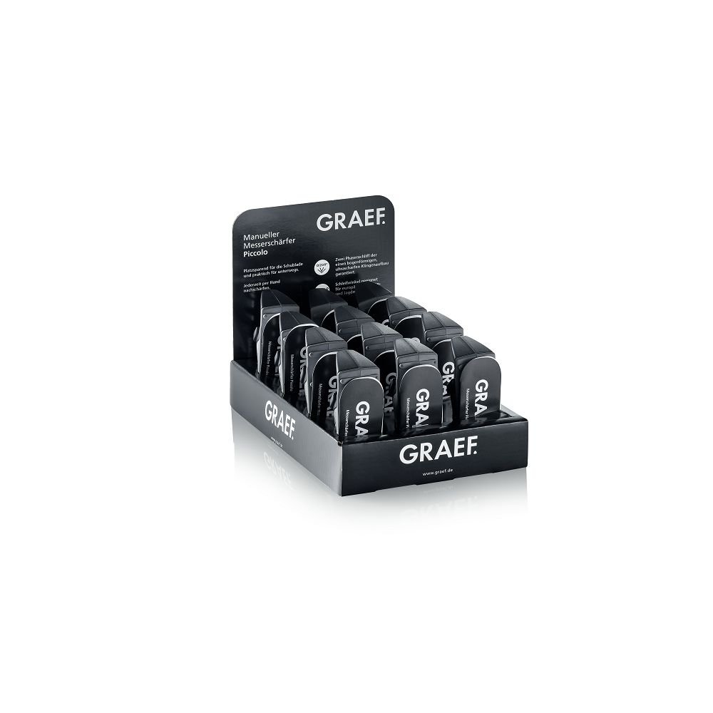 Zahvaljujoč dvema stopnjama ostrenja iz volframovega karbida (stopnja 1) in keramike (stopnja 2), noži hitro in brez truda ponovno pridobijo svojo ostrino. PICCOLO iz Graefa nadomešča klasično brusilno jeklo in je veliko lažji za uporabo.