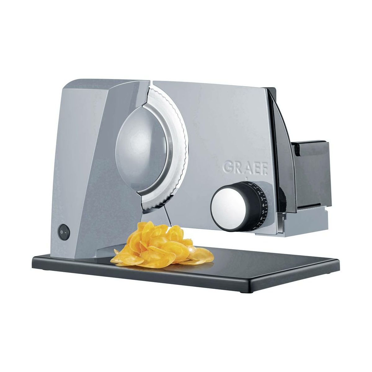 Kompaktni rezalnik hrane GRAEF SKS 110 v elegantno svetlo sivi barvi in nazobčanim rezilom.