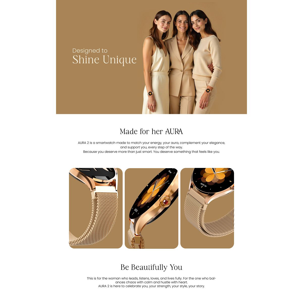 AURA 2 je ustvarjena za ženske, ki želijo več od svoje pametne ure – neko napravo, ki ne bo samo funkcionalna, ampak tudi vizualno izražala njihov slog in osebnost. Za osebe, ki iščejo eleganco v detajlih: obliko, barvo, ukrivljenost zaslona. Za tiste, ki želijo biti povezani in spremljati svoje zdravje brez odvečnih korakov – dovoljšno sledi srčnemu utripu, spanju, SpO2, športnim funkcijam. In seveda za tiste, ki cenijo, da ura zdrži nekaj dni brez polnjenja, a obenem izgleda kot modni dodatek, ne kot športna oprema.