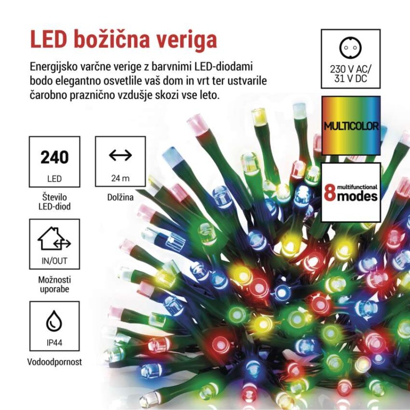 barva svetlobe: multicolor|barva žice: zelena|daljinski upravljalnik: ne|dimenzije: 24 m|dodatne funkcije: –|dolžina dovoda: 5 m|funkcije: 8 načinov (multifunkcijski)|garancijska doba: 2 leti|izdelek: veriga|izhodna napetost: 31 V DC|jeziki aplikacije: –|LED razmik: 10 cm|material: PVC|možnost povezave: ne|oblika: klasičen|obvestila v mobilno aplikacijo: ne|podprti operacijski sistemi: –|prenosna frekvenca: –|prihodna moč: 3,6 W|prodajna embalaža: 1 kos, škatla|programska ura: da|protokol: –|število LED: 240|tip napajanja: omrežni adapter|uporaba: zunanja in notranja|upravljanje z glasovnimi pomočniki: ne|velikost LED: 5 mm|vhodna napetost: 230 V AC|zaščita: IP44|za višino drevesa: 230 cm|združljivost: –|življenjska doba: 10 000 ur