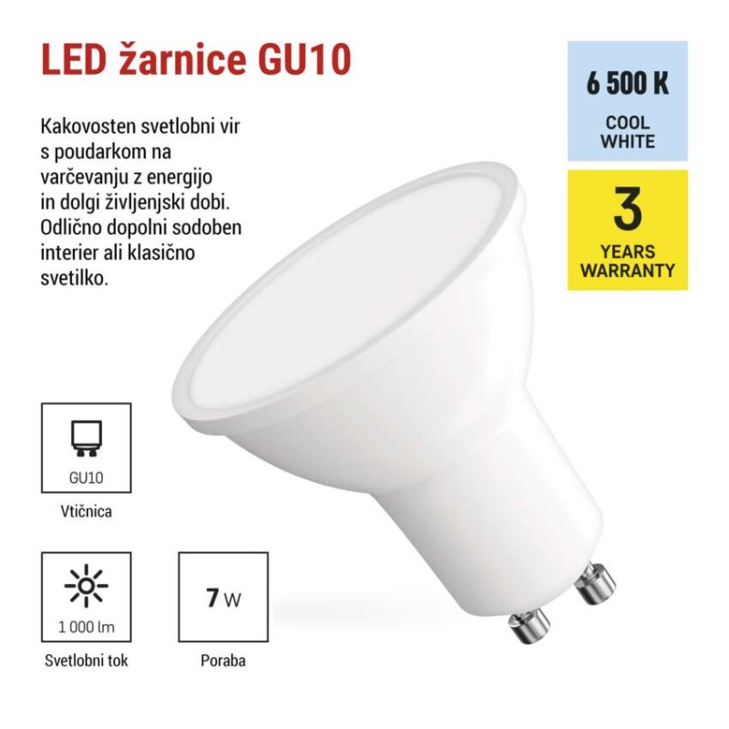 barva svetlobe: hladna bela|dimenzije: 50 × 50 × 58 mm|energetski razred: D|faktor: 0.50|frekvenca: 50/60 Hz|garancijska doba: 3 leta|indeks barvne reprodukcije (CRI): Ra >80|kompatibilnost: –|kot svetilnosti: 100°|linija: CLASSIC|nadomestilo za žarnico: 72 W|napetost: 220-240 V~|oblika: MR16|obvestila v mobilno aplikacijo: –|podprt OS: –|prenosna frekvenca: –|prihodna moč: 7 W|prodajna embalaža: 1 kos, škatlica|protokol: –|število čipov: –|število vklopnih ciklov: 30 000|svetlobna učinkovitost: 143 lm/W|svetlobni tok: 1 000 lm|tehnologija: LED|temperatura kromatičnosti: 6 500 K|tip čipov: SMD|upravljanje z glasovnimi pomočniki: –|vznožek (pritrditev žarnice): GU10|zatemnilna: ne|življenjska doba: 30 000 ur