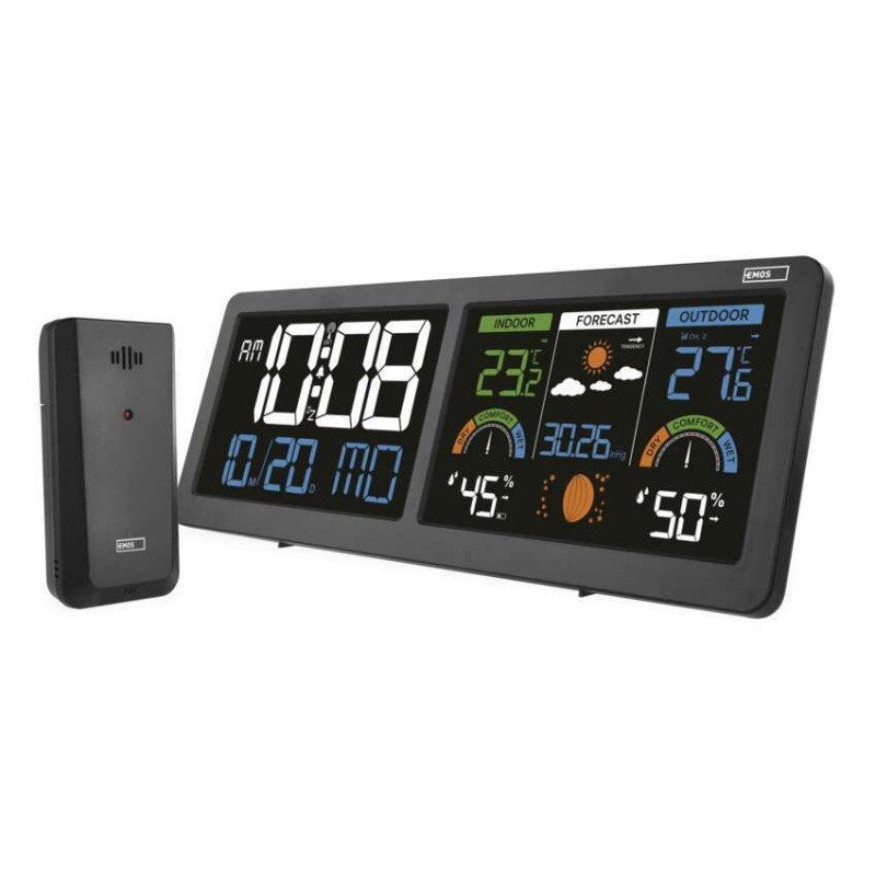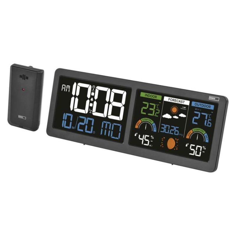 12/24 urni format: da|barometer: da|barvni zaslon (black mask) osvetljen: da|budilka: da|časovni pasovi: da|datum: da|dežemer: ne|dimenzije glavne enote: 284 × 25 × 107 mm|dimenzije senzorja: 50 × 25 × 95 mm|doseg senzorja: do 80 m|elektronska osvetlitev površine: da|izdelek: vremenska postaja|koledar: da|kompatibilnost: –|korekcija nadmorske višine: ne|LED osvetlitev zaslona: da|lunine faze: da|min. in maks. temperatura: da|možen drugi senzor: 3 (E05018)|možnost nastavitve enote temperature °C/°F: °C/°F|možnost obešenja na steno: da|napajanje postaje: 3× 1,5 V AAA (ni priloženo)|napajanje senzorja: 2× 1,5 V AAA (ni priloženo)|notranja temperatura: 0 °C do +50 °C, ločljivost 0,1 °C|notranja vlažnost: 20 % do 99 % RH, ločljivost 1 %|obvestila v mobilno aplikacijo: ne|omrežni adapter: da, 5 V DC/1 000 mA (priloženo)|ostale funkcije: –|podprt OS: –|ponovno bujenje: da|prenosna frekvenca: 433 MHz|prodajna embalaža: 1 kos, škatlica|projekcija: no|protokol: –|temperaturno opozorilo: da|tip termometra: brezžična|trajna osvetlitev: da|trend temperature: da|trend tlaka: da|upravljanje z glasovnimi pomočniki: no|ura: DCF (ura vodena z radijskim signalom)|velikost zaslona: 2× 125 × 80 mm|vetromer: ne|vremenska napoved: da|žična sonda za senzor: ne|zunanja temperatura: -40 °C do +70 °C, ločljivost 0,1 °C|zunanja vlažnost: 20 % do 99 % RH, ločljivost 1 %
