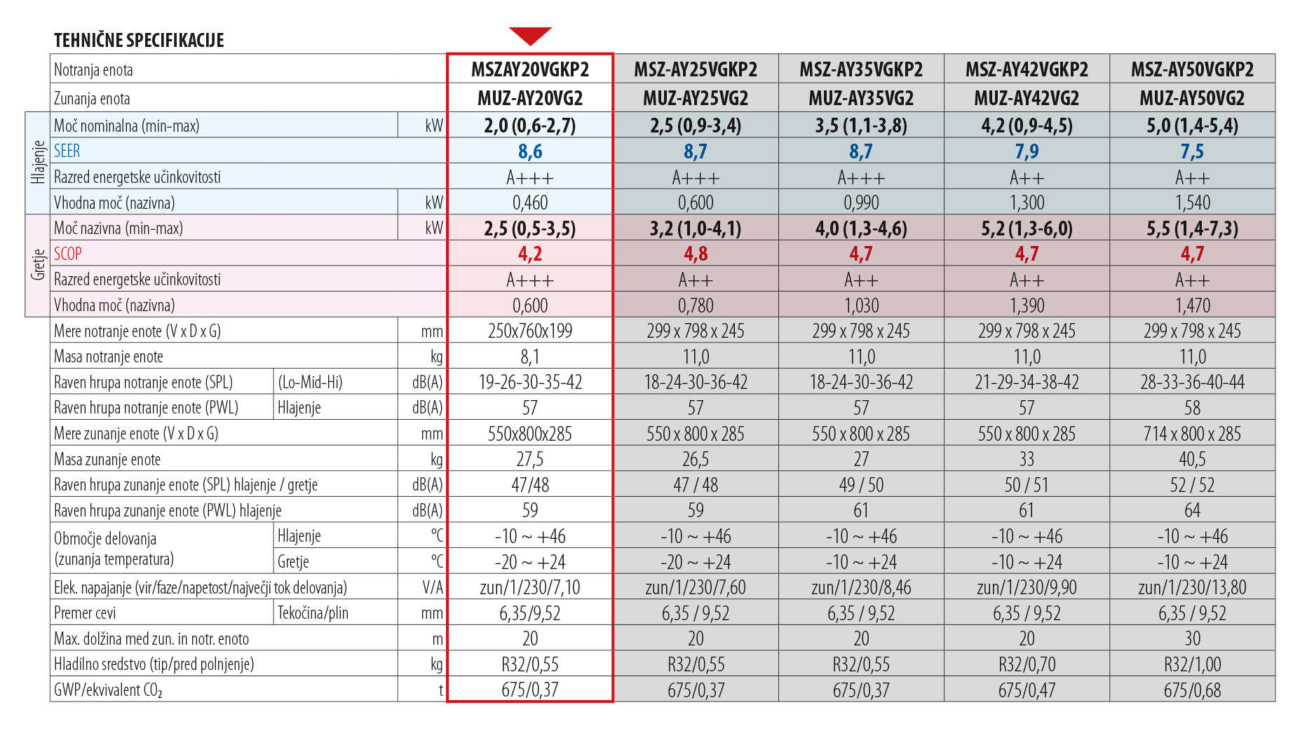 MSZ-AY25VGKP/MUZ-AY25VG je najnovejši model v seriji stenskih klimatskih naprav, ki so primerne tudi za ogrevanje v zimskem času, saj v načinu ogrevanja deluje do -20 °C. Posebnost modela je bela matirana površina stenske enote, ki se nevsiljivo integrira v sodobno opremljene prostore.