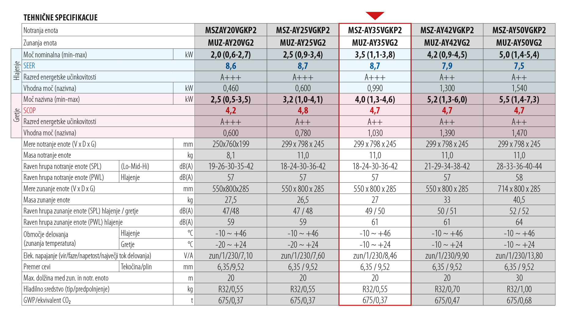MSZ-AY35VGKP/MUZ-AY35VG je najnovejši model v seriji stenskih klimatskih naprav, ki so primerne tudi za ogrevanje v zimskem času, saj v načinu ogrevanja deluje do -20 °C. Posebnost modela je bela matirana površina stenske enote, ki se nevsiljivo integrira v sodobno opremljene prostore.