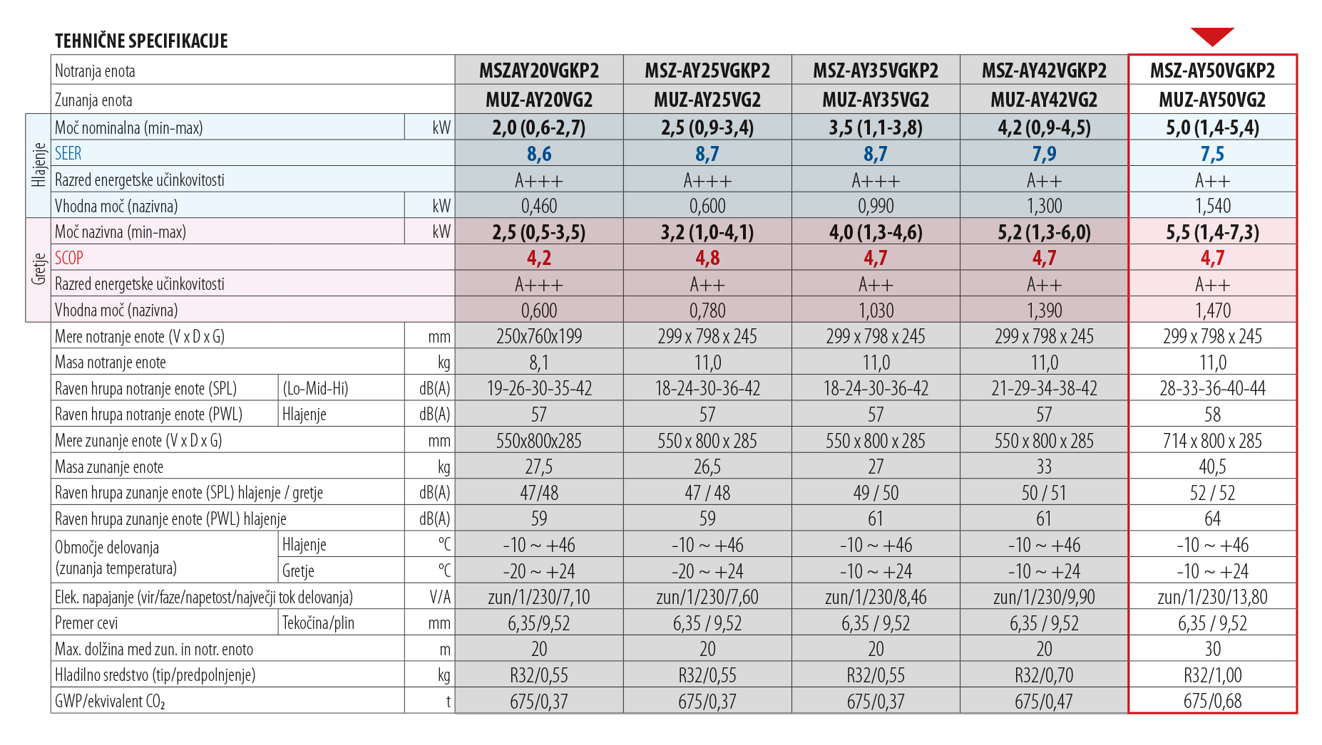 - energijski razred A+++ pri hlajenju in A++ pri ogrevanju za modela 25 in 35 ter A++ pri hlajenju in ogrevanju za modela 42 in 50