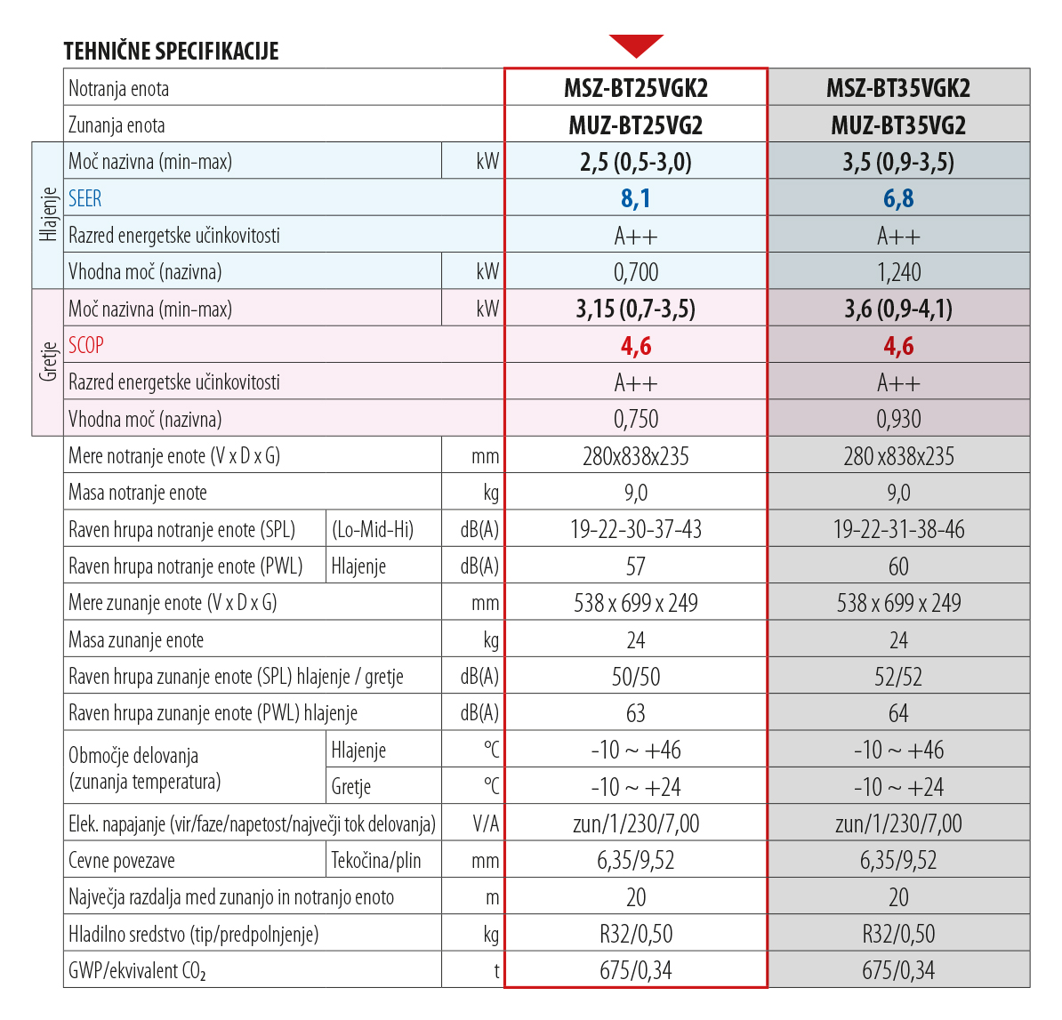 Pri najnižji hitrosti ventiliranja je delovanje zelo tiho, zaradi tega je primerna za namestitev v manjše prostore. Filter zraka »V-Blocking«, ki uničuje viruse, bakterije, alergene in spore (opcijsko). Namenjena je varčnemu hlajenju in ogrevanju prostorov, spada v energijski razred A++. Upravljanje prek daljinskega upravljalnika je enostavno, možna je nastavitev časovnika vklopa/izklopa. Upravlja pa se lahko tudi prek aplikacije MELCloud HOME.