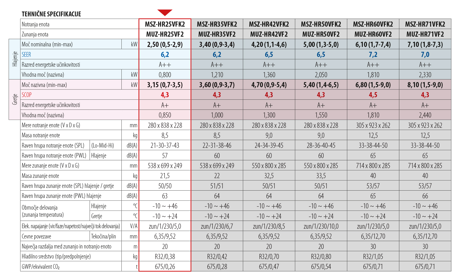 - šest modelov na razpolago, hladilne moči 2.5, 3.4, 4.2, 5.0, 6.1 in 7.1 kW
