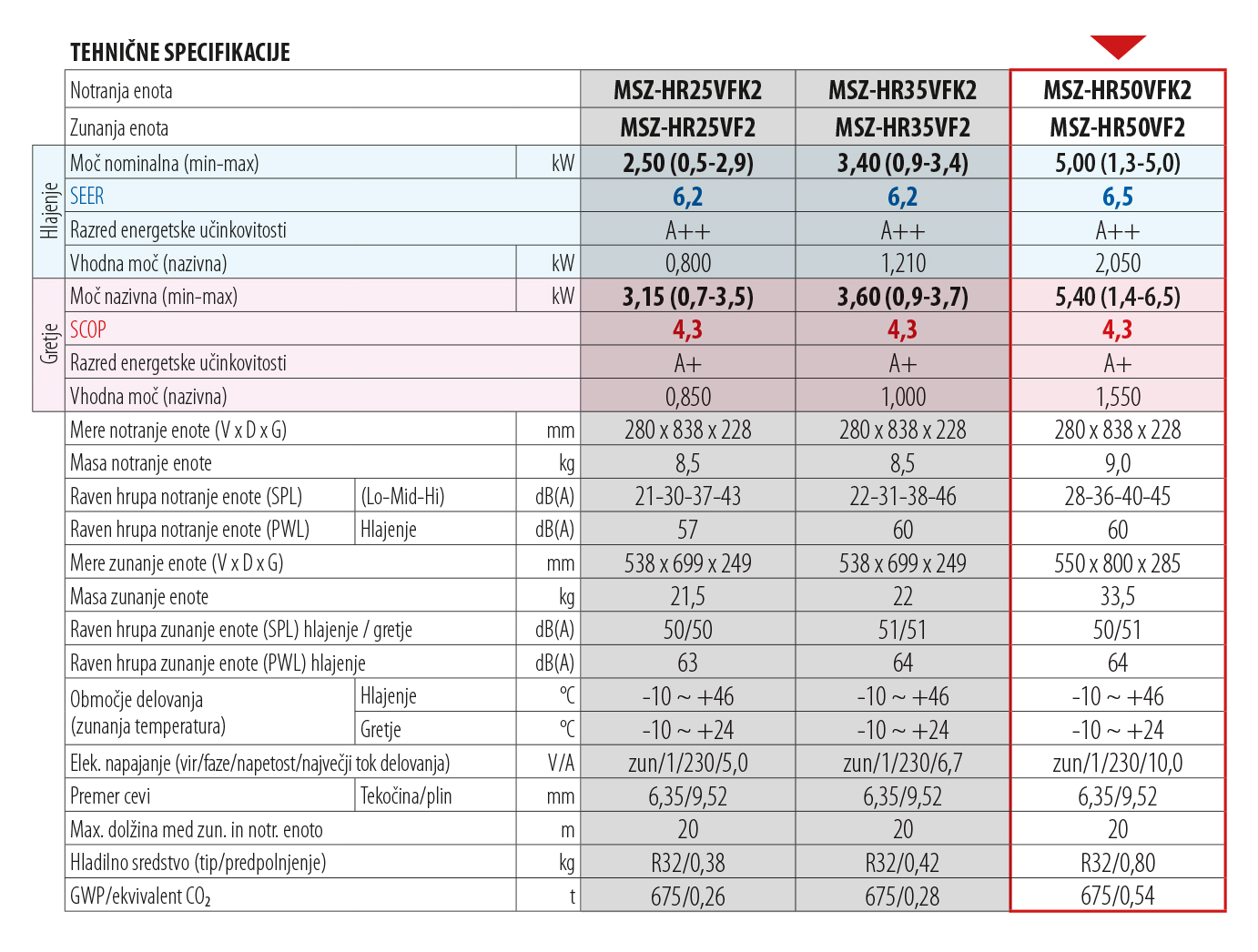 šest modelov na razpolago, hladilne moči 2.5, 3.4, 4.2, 5.0, 6.1 in 7.1 kW