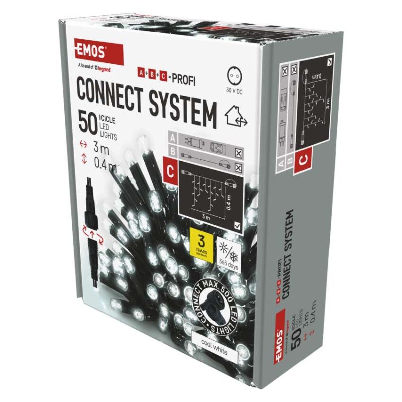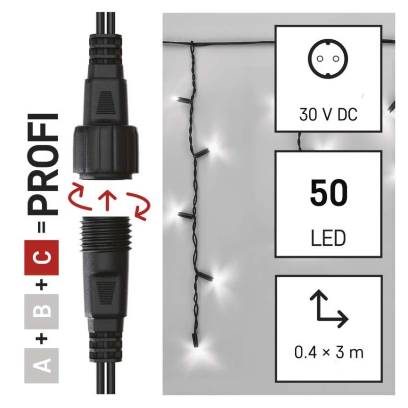 barva svetlobe: hladna bela|barva žice: črna|daljinski upravljalnik: ne|dimenzije: 3 × 0,4 m|dolžina dovoda: 10 cm|funkcije: sveti|garancijska doba: 3 leta|izdelek: kapniki|izhodna napetost: ne navaja se|LED razmik: 10 cm|material: guma|možnost povezave: da|oblika: klasičen|prihodna moč: max. 4 W|prodajna embalaža: 1 kos, škatla|programska ura: ne navaja se|število LED: 50|tip napajanja: omrežni adapter (ni priloženo)|uporaba: zunanja in notranja|velikost LED: 7 mm|vhodna napetost: 30 V DC|zaščita: IP44|za višino drevesa: ne navaja se|življenjska doba: 10 000 ur