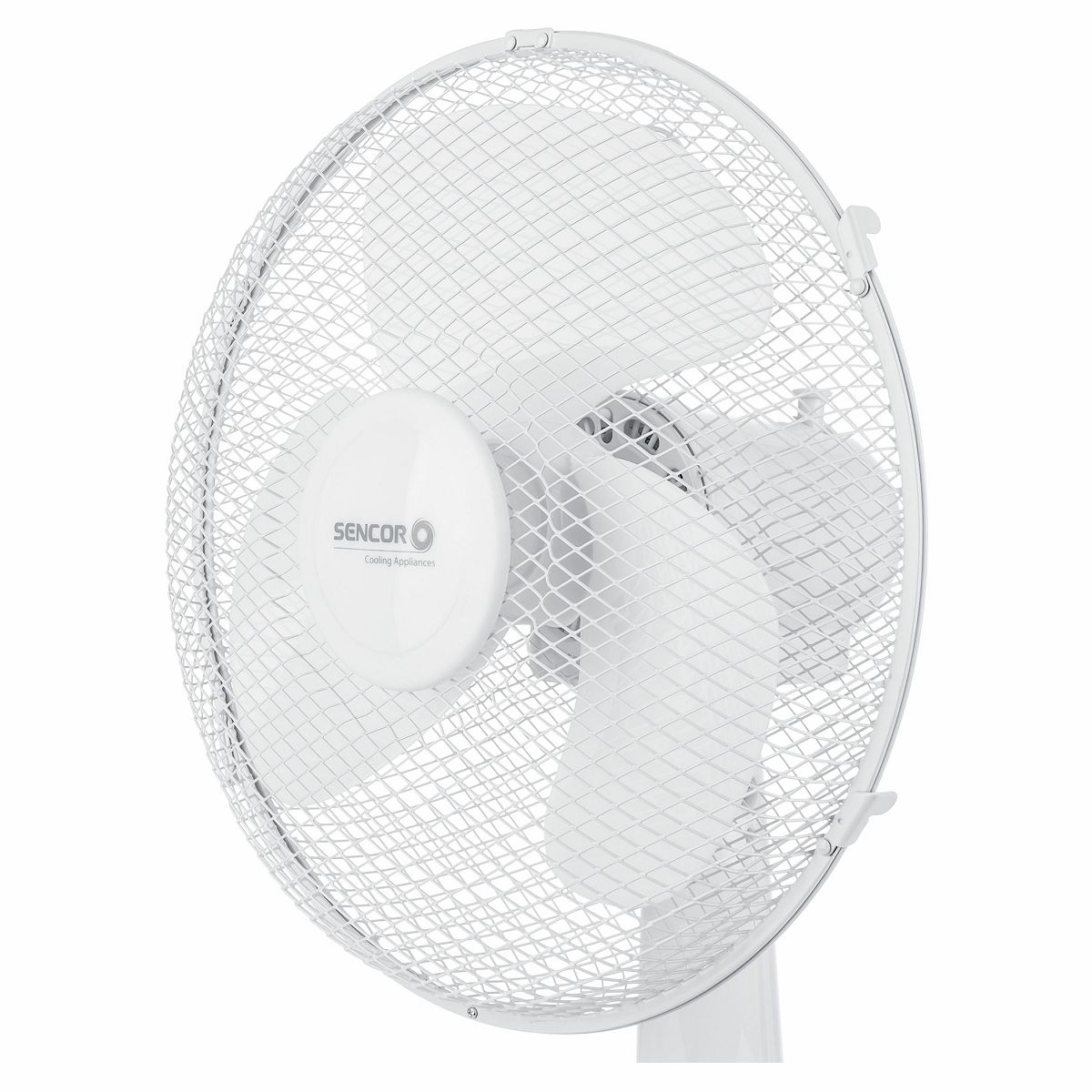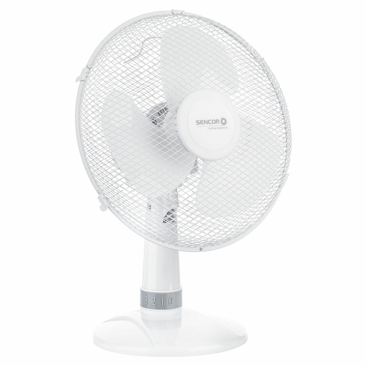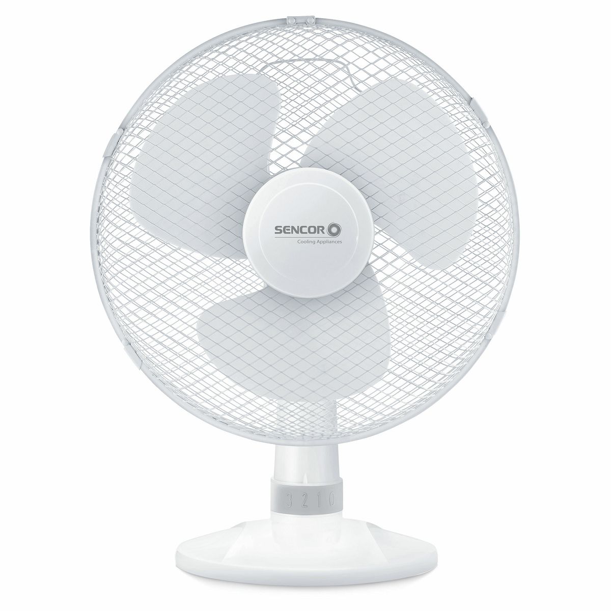 Namizni ventilator Sencor SFE 3027WH-EUE3 ima 3 stopnje hitrosti, premer lopatice 30 cm, samodejno vodoravno 90° nihanje z možnostjo izklopa in nastavljiv kot nagiba. Sprednja in zadnja rešetka sta kovinski. Ima protizdrsne noge in zaščito pred pregravanjem.
