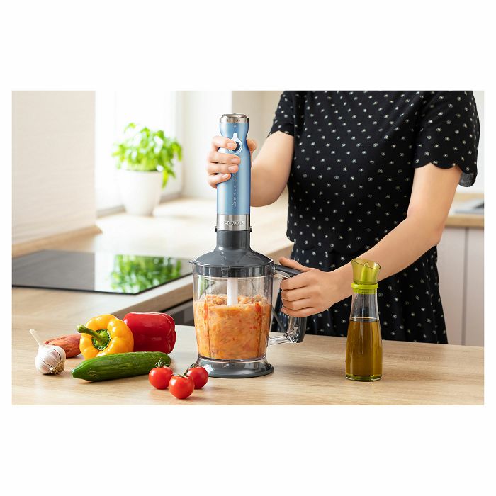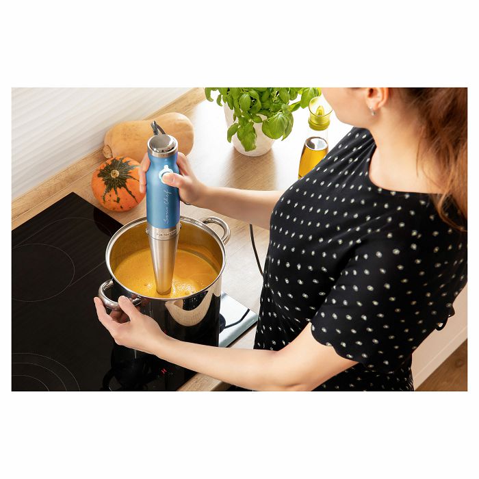 V paketu SENCOR SHB 5602BL-EUE3 boste našli bogato dodatno opremo. Z nastavki iz nerjavnega jekla lahko mešate tudi vroče jedi. Metlica iz nerjavečega jekla z dvema lopaticama lahko poskrbi za puhasto stepeno smetano. Praktični sekljalnik z rezili iz nerjavečega jekla sprejme do 1,25 litra sestavin. Posamezne nastavke lahko preprosto odstranite z gumbom.