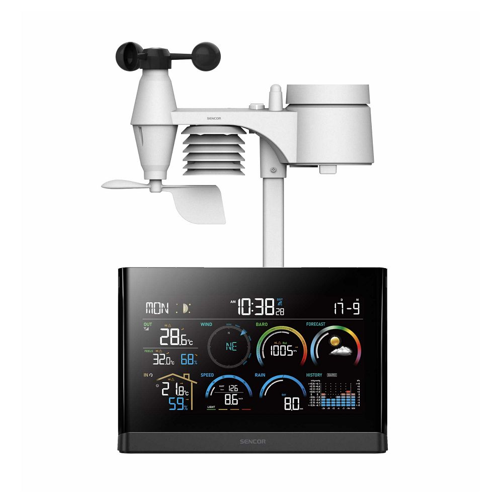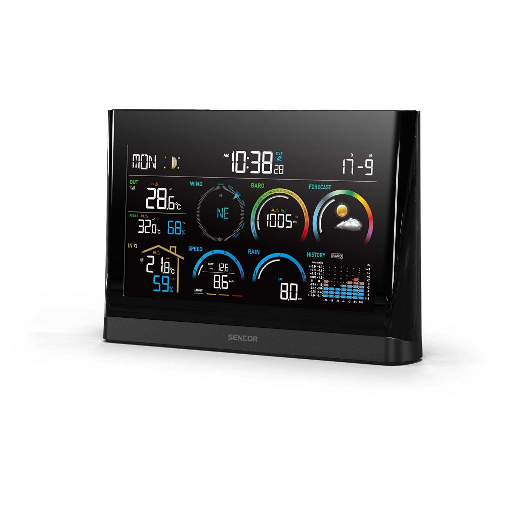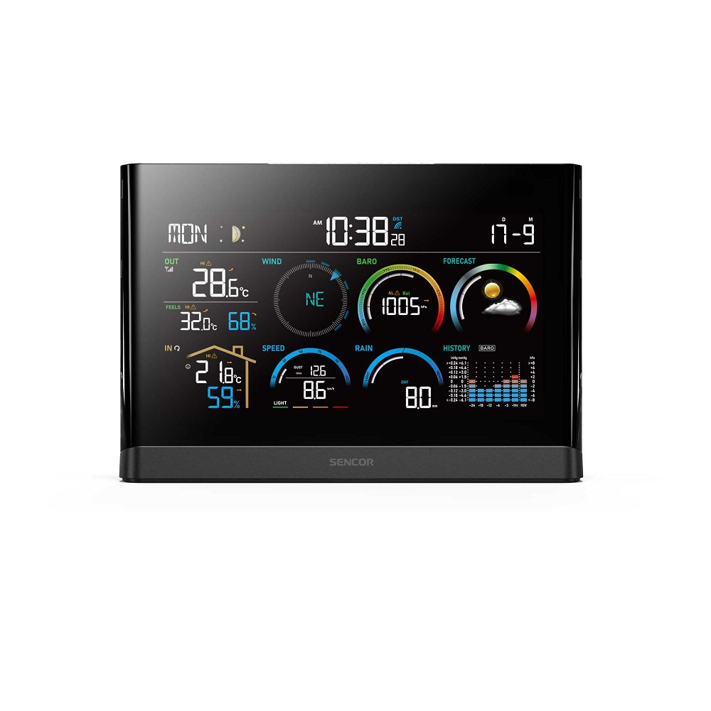 SENCOR SWS11000 vremenska postaja prinaša napredno meteorologijo v udobje vašega doma. Navdušeni boste nad široko paleto funkcij, ki jih ponuja ta postaja. SWS11000 je opremljen s 7,4-palčnim barvnim zaslonom TRUE BLACK s 3 stopnjami svetlosti (visoka, nizka, samodejna zatemnitev). Samodejno se prilagodi svetlobnim pogojem v prostoru. Njen 5-v-1 brezžični senzor s švicarskimi senzorji SENSIRION, ki je priložen glavni enoti, omogoča napravi spremljanje temperature, vlažnosti, tlaka, smeri in hitrosti vetra, padavin in drugih dejavnikov.