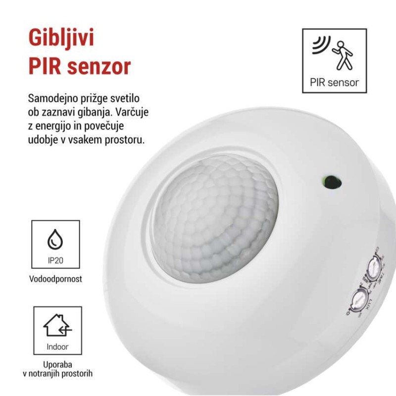 aplikacijski jeziki: –|barva: bela|čas vklopa: min. 10 sekund – maks. 15 minut|dimenzije: 108 × 108 × 52 mm|doseg zaznavanja: 6 m|glasovna komunikacija: –|izdelek: tipalo gibanja|kompatibilnost: –|kot polja zaznavanja: 360°|maks. kapacitativna obremenitev: 600 W|maks. uporna obremenitev: 1 200 W|material za vgradnjo: –|napajanje: 220–240 V~|občutljivost: <3 Lux|obvestila v mobilno aplikacijo: –|ostale funkcije: –|podprt OS: –|prenosna frekvenca: –|prodajna embalaža: 1 kos, škatlica|protokol: –|shranjevanje na kartici SD: –|shranjevanje v cloudu: –|tip senzorja: PIR|upravljanje z glasovnimi pomočniki: –|zaščita: IP20