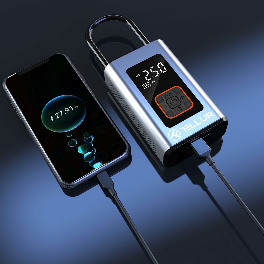 Kompresor, ki ga napaja robustna 4000 mAh litijeva baterija s polnjenjem USB-C (5 V/1 A), se napolni v samo 3 urah in deluje kot napajalnik za vaše naprave. Vgrajena svetilka LED z načinoma Solid in SOS zagotavlja, da nikoli ne ostanete v temi, kar zagotavlja varnost in udobje med nočno uporabo.